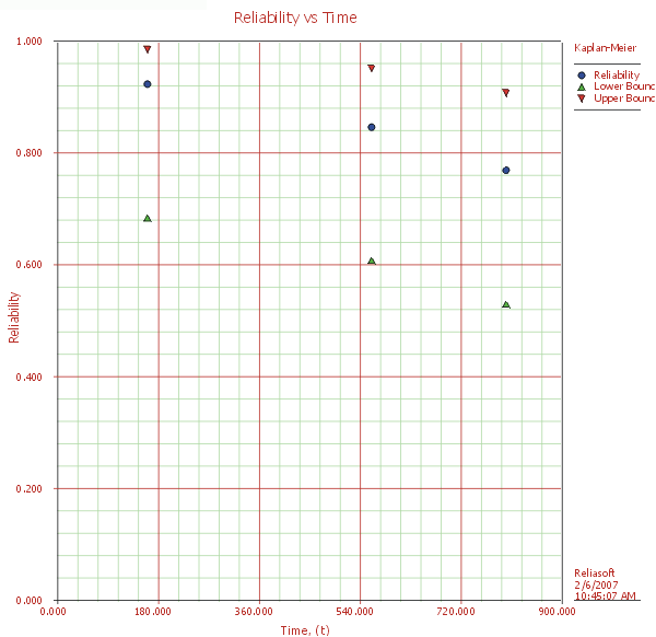 Using the Kaplan-Meier non-parametric method, we obtain the following reliability plot (with 90% two-sided confidence bounds).