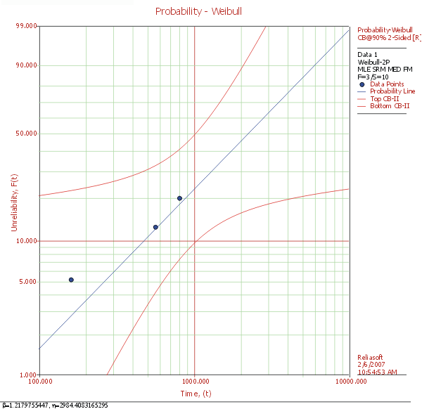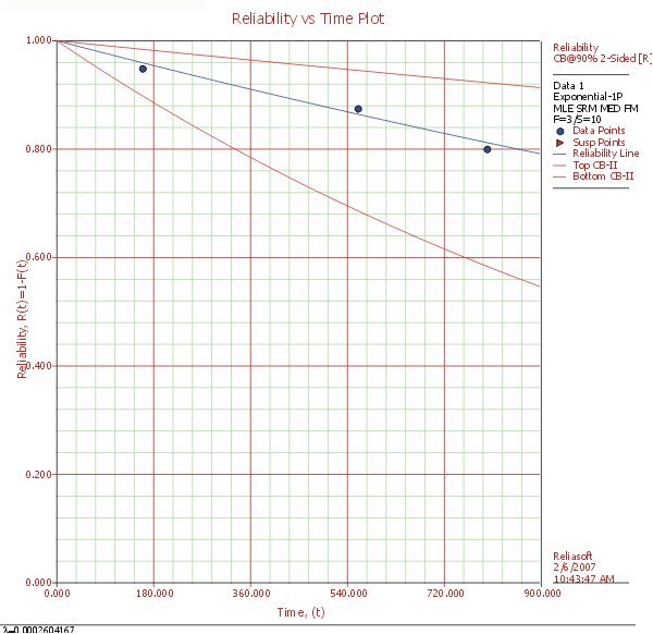 Assuming that the design has a constant failure rate, we obtain the following probability plot (with 90% two-sided confidence bounds on reliability) for the data set in Table 1.