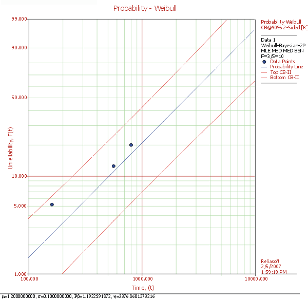 Notice that in the above figure, the confidence bounds for the the two-parameter Weibull are wider compared to the bounds in Figures 3 and 4. This is due to the fact that in the case of the one-parameter Weibull and the Weibull-Bayesian distributions, a prior idea about the β parameter is available and helps reduce the uncertainty in the estimates.