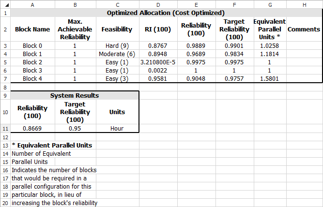 - Equivalent parallel units, which indicates the number of identical blocks that would be required in a parallel configuration for the particular block to meet the specified reliability goal, in lieu of increasing the component's reliability.