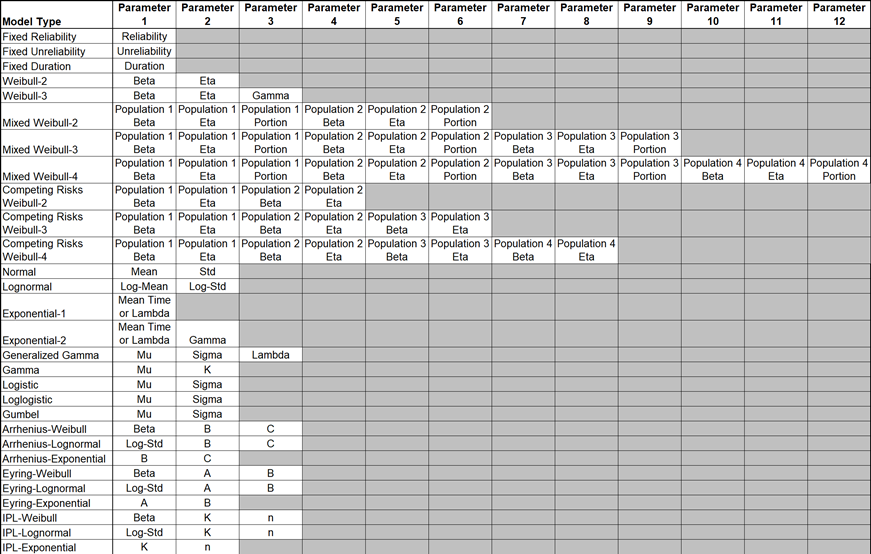 Tip: If you change the information in one column, it may affect the information required in another column. For example, if you are editing a model and you change the Model Type column from "Weibull-2" to "Weibull-3," then the Parameter 3 column will change from "N/A" to requiring a numerical input for the third parameter for the Weibull distribution (i.e., gamma).