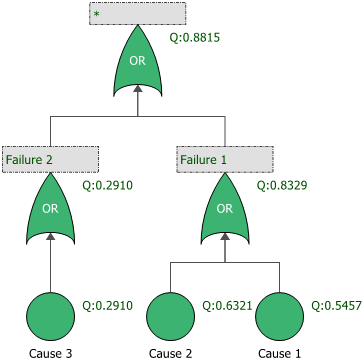 The fault tree shows the causes as events, with associated reliability information if it was specified in the original analysis. The cause events are connected to OR gates that represent the failures associated with the causes; these OR gates are connected to the top OR gate, which represents the selected effect(s).