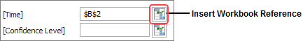 For example, if you want to obtain the probability of failure for the time that has been entered in cell B2, the function could be either =PROBFAIL(B2) or =PROBFAIL($B$2). You can type the cell location directly into the field or click the Function Wizard’s Insert Workbook Reference icon to insert the reference to the cell currently selected in the sheet. If you want to insert an absolute reference, press CTRL while you click the icon.