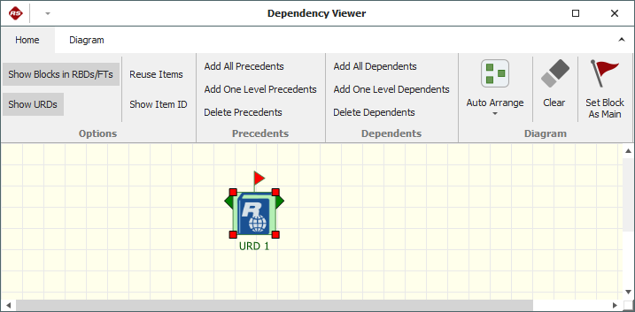 To understand how to use this view, consider the same example shown in the Dependency Viewer topic. Clicking the Diagram View button for that example will yield a diagram view that shows only the main item (in this case, the URD), which is marked with a flag: