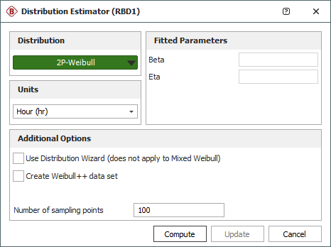 To calculate the parameters for a different distribution, choose the distribution in the Distribution area and specify the time units in the Units area, then click Compute. BlockSim will use the Weibull++ life data analysis engine to calculate the distribution parameters based on the diagram.
