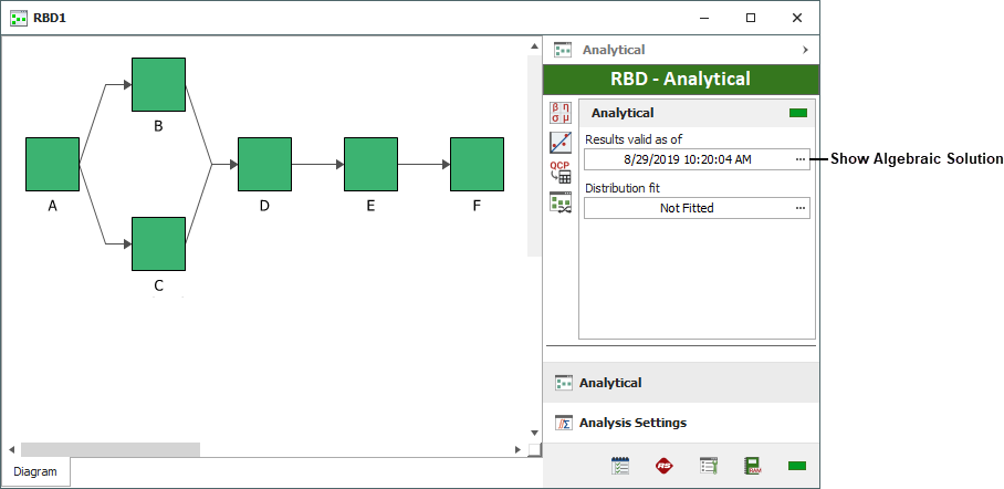 There are two ways to view the system reliability equation: as a symbolic equation or as the complete equation. When you are using the symbolic equation view, you can choose to view the reliability equation, the pdf equation or the failure rate equation for the system. The symbolic equation uses tokens to represent portions of the equation. If you use the symbolic equation view, you should read the solution from the bottom up, replacing any occurrences of a particular token with its definition. For example, consider the RBD shown next.