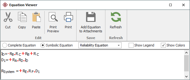 Select Show Legend to display the reliability characteristics for each block within the analyzed diagram. Select Show Colors to use color-coding in the window to make the equations easier to view. If you have made changes to these settings, click Refresh to update the contents of the window.