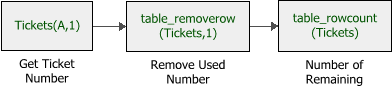 Event analysis tables store only numerical values, and the values can be used or manipulated during simulation by using certain event analysis internal functions. The following configuration, for example, shows how to use two particular internal functions. In this example, the first block evaluates to a table reference, which draws the value stored in the specified cell. The second block evaluates the "table_removerow" function, which deletes the specified row from the specified table. The third block evaluates the "table_rowcount" function, which returns the number of rows that contain data in the specified table.