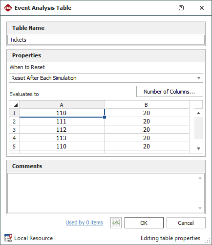 An event analysis table stores an array of values in rows and columns. This table can have up to 65,536 rows and 256 columns. The following example shows the properties of an event analysis table called "Tickets." A reference to an event analysis table requires inputs for the column number or name and the row number. For example, both Tickets(1,1) and Tickets(A,1) are references to the cell located in the first column and first row of the table.