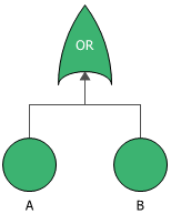 Fault tree diagrams consist of gates and events connected with lines. The AND and OR gates are the two most commonly used gates in a fault tree. To illustrate the use of these gates, consider two events (called input events) that can lead to another event (called the output event). If the occurrence of either input event causes the output event to occur, then these input events are connected using an OR gate. Alternatively, if both input events must occur in order for the output event to occur, then they are connected by an AND gate. The next figure shows a simple fault tree diagram in which either A or B must occur in order for the output event to occur.