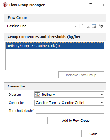 The Group Connectors and Thresholds area displays all of the flow connectors in the flow group, along with their specified thresholds, in the format [Diagram Name]/[Block Name -> Block Name](Threshold #).