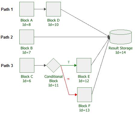 The following example shows a flowchart that has three starting blocks (with the block IDs shown). Each starting block represents an individual path. The starting block with the lowest block ID number has the highest priority in the queue; therefore, in this case, the first path to be simulated is Path 3, followed by Path 2 and then Path 1.