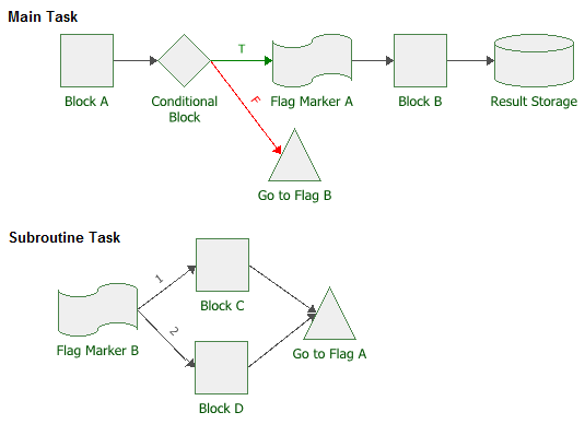 - Subroutine Path 2: Block D → Go-to-Flag A → Flag Marker A → Block B → Result Storage.