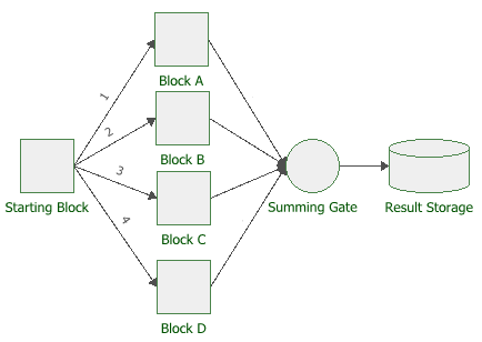 The following example shows a summing gate that is configured to require 2 inputs before it passes any output to the result storage block. (The connector priorities of the starting block's outgoing paths are also shown to provide context.) In this case, the summing gate will pass two results to the result storage block: once with the value of blocks A+B, and once with the value of blocks C+D.