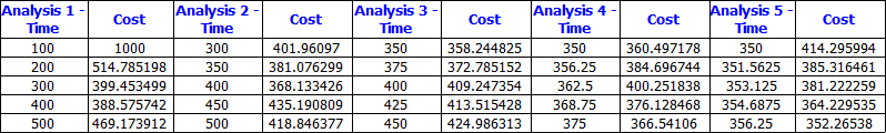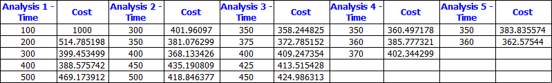 With these settings, Analysis 1 consists of runs performed with the Time variable at 100, 200, 300, 400 and 500. The minimum value for the Costs variable in the first analysis is found at 400. The range for Analysis 2 is +/- 1 increment around 400 (i.e., 300 - 500), and that range is divided into the same number of steps used in the previous analysis. The minimum value for the Costs variable in the second analysis is found at 400. The range for Analysis 3 is +/- 1 increment around 400, where the increment is the one used in Analysis 2 (i.e., +/- 50, yielding a range of 350 - 450). This continues until the stopping condition is reached, as explained next.