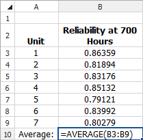 For example, to calculate the average reliability for the following units, you would choose Formulas > Function Library > AutoSum Average. Select cells B3 through B9 and press ENTER. Note that the cell references can be relative (B3:B9) or absolute ($B$3:$B$9). (See Referencing a Cell.)
