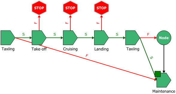 Each of the operational phases in this diagram has two paths leading from it: a success path and a failure path. This graphically illustrates the consequences in each case. For instance, if the first taxiing phase is successful, the airplane will proceed to the take-off phase; if it is unsuccessful, the airplane will be sent for maintenance. The failure paths for the take-off, cruising and landing phases point to stop blocks, which indicate that the simulation of the mission ends. For the final taxiing phase, both the success and failure paths lead to the maintenance path; the node block allows you to model this type of shared outcome.