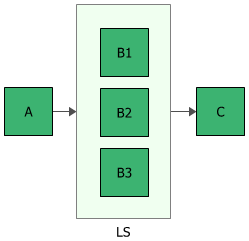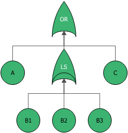 The next two figures show a fault tree diagram using a load sharing gate and the equivalent reliability block diagram. To understand these diagrams, remember that the fault tree looks at failure combinations while the RBD looks at success combinations. Thus, the fault tree shows a system that will fail if component A fails, component C fails or three out of the three B components fail.
