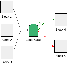 For example, in the configuration shown next, the logic gate evaluates the outputs of Blocks 1, 2 and 3 against a conditional expression, and then evaluates the overall outcome based on the gate type. If the outcome is true, then an output is passed down the "true" (T) path to Block 4, but if the outcome is false, an output is passed down the "false" (F) path to Block 5.