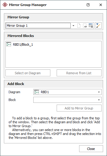 - To add a block to the mirror group, you can select the diagram and block in the Add Block area and click the Add to Mirror Group button. You also can select the block(s) in the diagram, press CTRL+SHIFT and drag the block to the list in the Mirrored Blocks area of the Mirror Group Manager. Note that when you add a block to the mirror group, its properties will be updated to match those of any block(s) already in the mirror group.