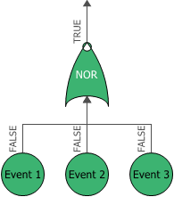 A NOR gate has a true output event when all input events are false. In other words, if none of the input events occur, then the output event will occur. This is logically equivalent to using an OR gate followed by a NOT gate.