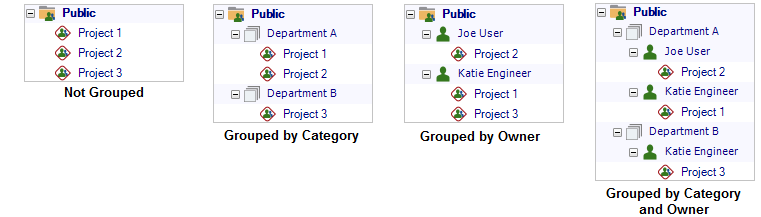 Projects are always grouped based on whether they are public, private or reference. For additional grouping, select the Group by category and/or Group by owner check boxes. If you select both, the results will be grouped first by project category and then by project owner. For example: