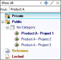 You can also search for projects by entering text in the Find field. The project list updates dynamically to show only the projects with names that contain the text that you have entered. As an example, the following picture shows a quick way to find all of the projects for a particular product line by using the project names instead of predefined categories or other filter criteria.