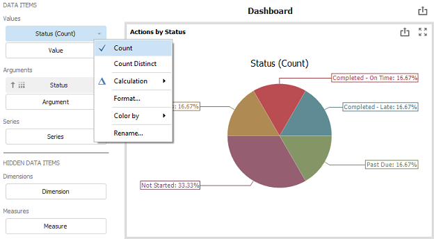 This pie chart uses the Count value for a text field to show the actions in the current project plan broken down by status. The argument determines the slices shown in the pie.