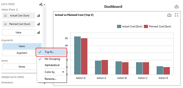 This bar chart uses the Sum values for two number fields to show the top 5 most costly actions in the current project plan, with comparison to the planned cost. The arguments determine how the bars are labeled, grouped and sorted.