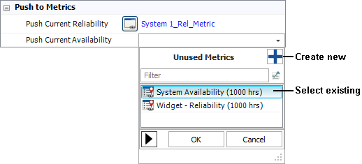 The Push to Metrics fields on the Properties tab of the Analysis panel in XFMEA/RCM++ enable you to "push" the reliability and availability values that were calculated/simulated from the Failure Modes and Reliability Analysis (FMRA) to metric resources.