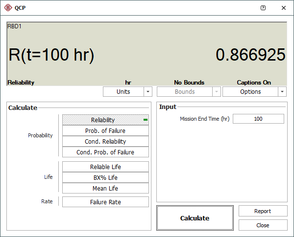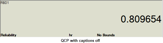 - Select Captions if you want additional information to be displayed in the results area along with the values (a green light in the button indicates that this option is selected). For example, if you have selected to calculate the reliability for a given period of time, the first picture shows the display with captions and the second picture shows without.