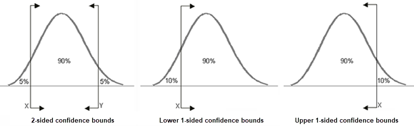 - For analytical diagrams, use the Bounds drop-down list to specify what type of confidence bounds to calculate. The following graphics illustrate the types. The Life Data Analysis Reference provides more information on the background theory of confidence bounds at: https://help.reliasoft.com/reference/life_data_analysis/lda/confidence_bounds.html.