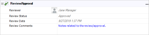 Action resources can be marked for review and approval. If the Reviewer property is enabled in the configurable settings for the current project, you can click Show Review/Approval in the action ribbon to hide or display these fields for any given action.