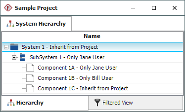 For a quick way to reset all of the item permissions to the defaults, you can open the Item Permissions window for SubSystem 1, set to Inherit from parent item and select the Apply to all dependents check box. The resulting system hierarchy is shown next.