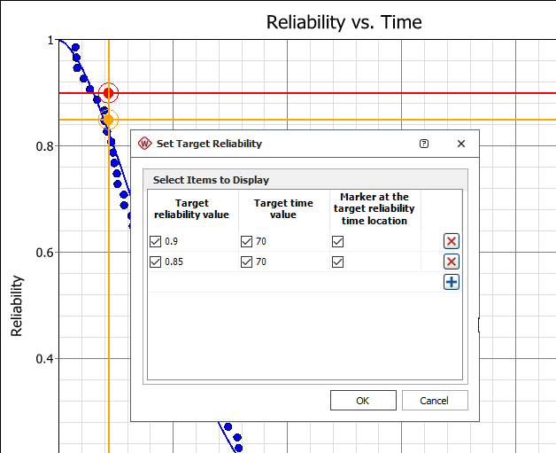 You can select to show a specified target value (displayed as a horizontal line), target time value (displayed as a vertical line), and/or insert a marker at the point where the two target values intersect. Below is an example for a plot that shows the target reliability.