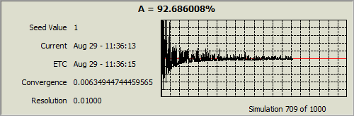 You can use the Resolution field in the Display Options drop-down to specify the scaling of the convergence plot. The larger the number, the greater the range of values shown on the y-axis of the plot. The Update Increments field specifies how many times the label below the plot, reflecting the current number of simulations performed out of the total number of simulations, will be updated during the simulation process.
