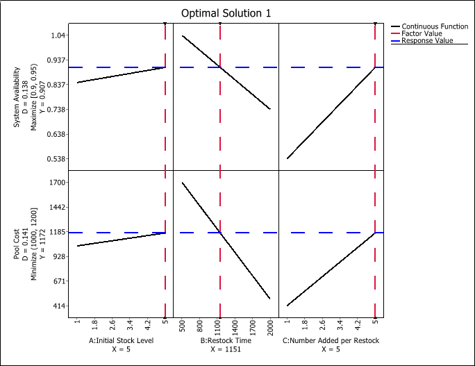 The results of optimization for our example are shown next. A single optimal solution is found with Initial Stock Level = 5, Restock Time = 1151 and Number Added per Restock = 5. This gives a system availability of .907 and pool cost of 1172.