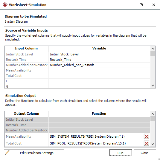 - If the associated diagram is a simulation RBD, define the function to calculate from each simulation. This is done by clicking the cell associated with the result column to open a limited version of the Function Wizard, where only the simulation functions are available.