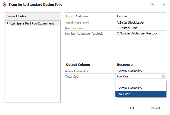 In the window that appears, select the design folio to transfer to and match up the columns in the design folio (factor/response columns) with the columns in the simulation worksheet (input/output columns), as shown next.