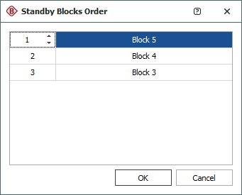 In the Standby Blocks Order window that appears, the standby blocks are displayed in the order in which they will be used. Select a block and use the up and down arrows that appear in its order number cell to move the block up and down the list. For example, in the window shown next, you would click the down arrow once to move Block 5 down one position; the result would be that Block 4 would be used first, then Block 5, then Block 3.