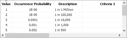To configure either type of scale, you must enter the Occurrence Probability (Q) for each rating in the scale (this was called “Quantitative Value” in Versions 8 and 9). As an example, here’s an excerpt from the “RS DFR Focus” occurrence scale that is installed with the software, where “1 in 1 Million” is 0.000001, and so on.