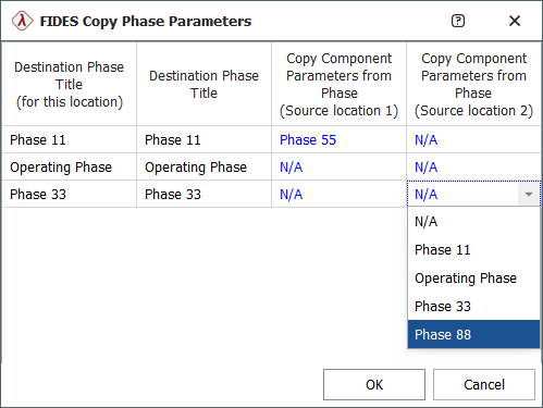 The selected options shown would set the "Phase 11" phase parameters to the same ones the component had set for "Phase 11" in the original location. "Operating Phase" will be set to the defaults. "Phase 33" will be set to the phase parameters that the component had for "Operating Phase". The "Phase 33" and "Phase 88" parameters the component had are not copied to any destination phase.