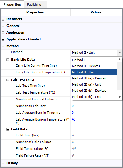 If you use Method II or Method III, you have to specify whether the test/field data were collected for the entire assembly (unit) or for the individual component (devices). The application will enable the appropriate Lab Test Data or Field Data properties based on your selection. For example, if you select the "Method II-Unit" option, the Lab Test Data properties will be enabled only for the block, but if you select the "Method II-Devices" option, those properties will be enabled only for the components under the block.