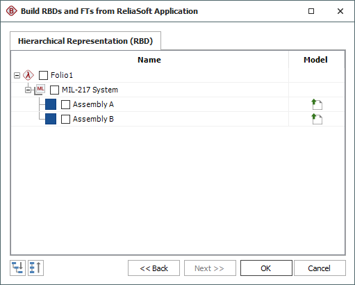 If you select all of the items shown in this hierarchy and click OK, BlockSim will create a diagram for the "MIL-217 System" that links to one subdiagram for Assembly A and another for Assembly B, as shown next.