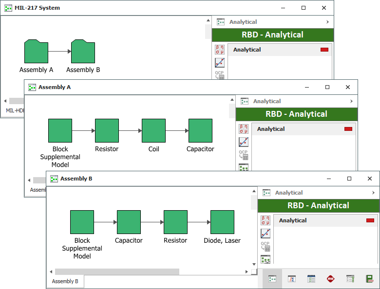 Note: For many of the reliability prediction standards available in Lambda Predict, a portion of the assembly's failure rate may be calculated at the block level. In Lambda Predict, this portion is called the block's supplemental model. For example, in MIL-217 analyses, the failure rate for a printed circuit board (PCB) assembly is a summation of the individual failure rates of its components plus the failure rate due to the physical connection of the components to the board. If you have chosen to create subdiagrams for such assemblies, the diagrams will contain the reliability models of all the components in the assembly plus the supplemental model that represents the failure rate due to the connections.
