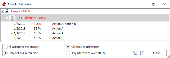 Regardless of whether you’re checking a single action or the entire project plan, the utility shows All resource utilizations by default. Alternatively, you can choose to see Only utilizations over 100%.