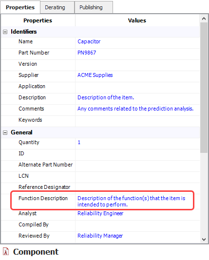 Any item properties in Lambda Predict that have an equivalent field in XFMEA/RCM++ analyses (such as Part Number, Supplier, Item Description, etc.) will be imported.