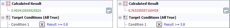 The Target Conditions feature color-codes the current value of the metric. If all specified conditions are met, then the metric's value will be displayed in green. If one or more conditions are not met, then it will be in red. For example, in the following pictures, the result is green if the estimated system reliability is at least 80%, and red if it is not.