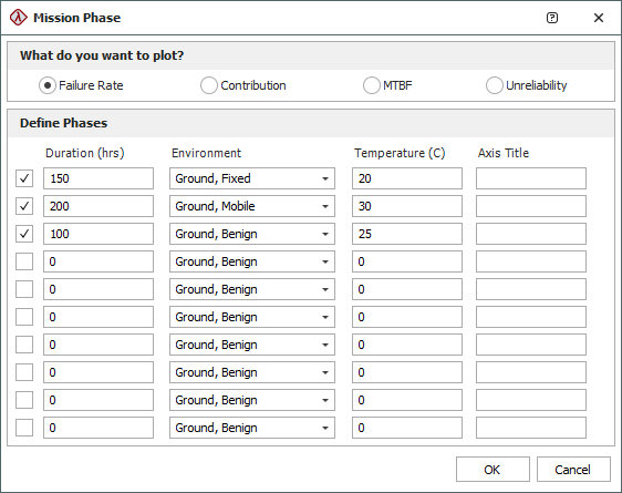 The first time you create the plot, the Mission Phase window will be displayed automatically. Select a metric of interest (i.e., failure rate, contribution, MTBF or unreliability), and then define the conditions of each mission phase. For each phase, enter the mission duration in hours, choose an environment and enter the temperature in degrees Celsius. If desired, you can also specify the title that will be displayed on the x-axis of the plot for each phase. If you do not specify titles, the default titles (i.e., "Phase 1," "Phase 2," etc.) will be used.