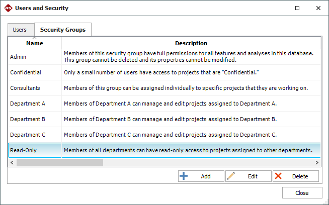 5. For the example shown below, users from Department A will have read/write access (because they belong to the "Department A" security group), users from Departments B and C will have read-only access (because they belong to the "Read-Only" security group) and Fred Consultant will have read/write access (because he belongs to the "Consultants" security group and has been specifically assigned to have those permissions in this project).